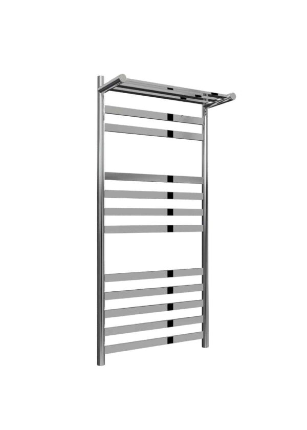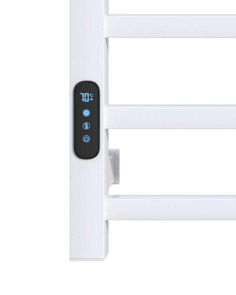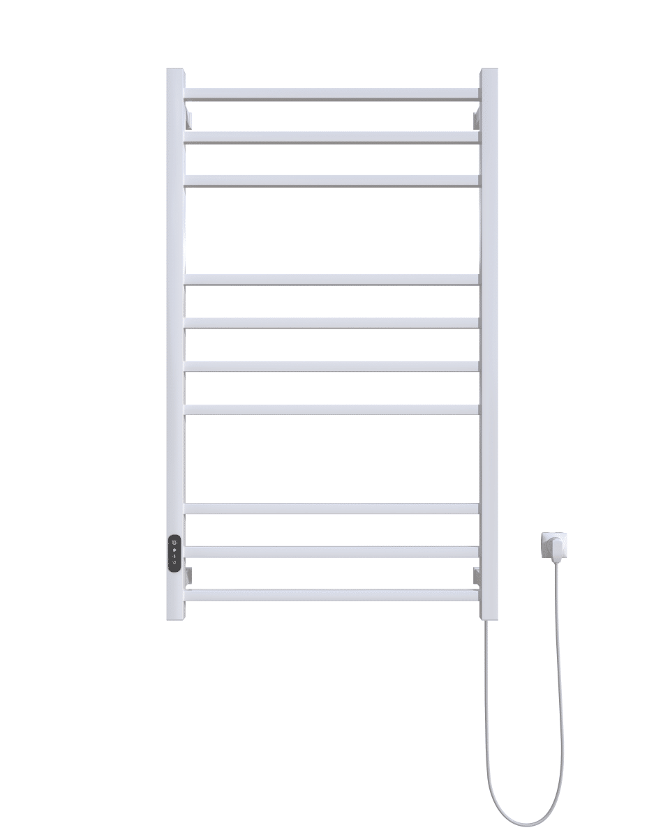 Elektrisk fyrkantig handdukstork i vit fyrkantig rördesign i vitlackerad rostfri stålfinish med inbyggd termostat och timer.